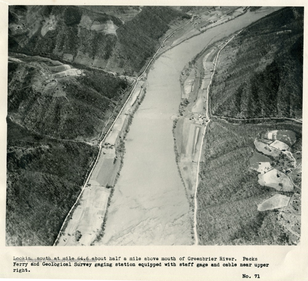 - 'Looking south at mile 64.6 about half a mile above mouth of Greenbrier River. Packs Ferry and Geological Survey gaging station equipped with staff gage and cable near upper right.'