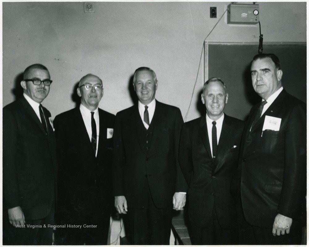 - A portrait of Governor Hulett Smith (third from right) and West Virginia University president Paul Miller (second from right), standing with three other men.
