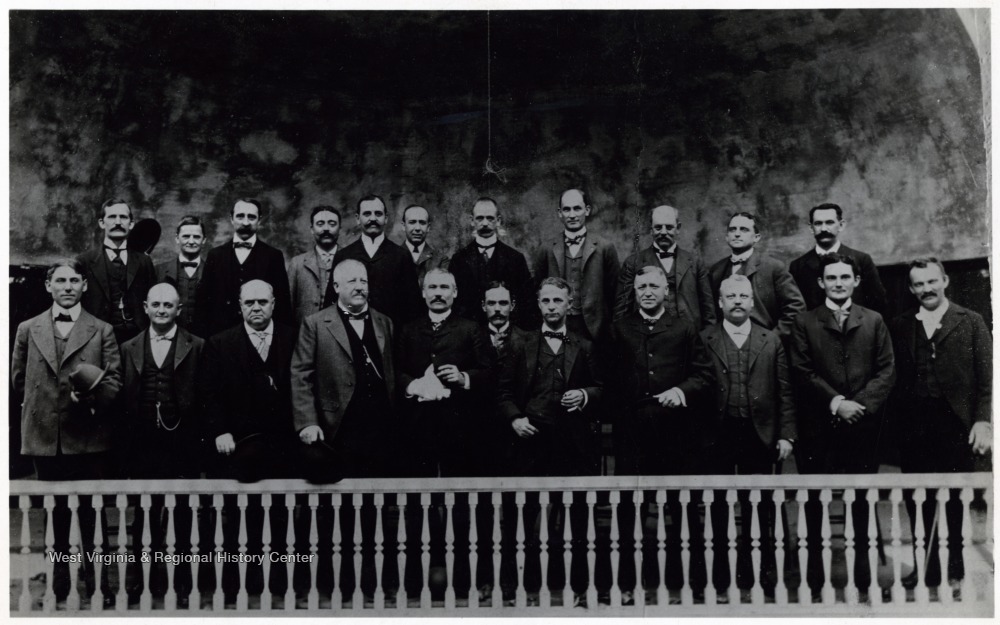 - 'Top Row: No. 1. C. Hirsch, Wheeling, W. Va. No. 2. Harry McLure, The McLure, Wheeling, No. 3. F. G. Warden & Doty Hotels, Newark, Ohio. No. 4. Homer Smith, Phoenix Hotel, Pt. Pleasant, W. Va. No. 5. Geo. Stamm, Stamm Hotel, Wheeling, No. 6. Clark Hamilton, Wheeling, W. Va. No. 7. Harry Adams, Windsor Hotel, Wheeling, No. 8. Lloyd E. Smith, The Blennerhassett, Parkersburg, No. 9. Geo. O. Taylor, President of the Assn., No. 10. C. C. Horton, Pres. Ohio State Hotel Assn., No. 11. The Colonial Hotel, York, Pa. Mr. John E. Williams; 2nd Row: No. 1. Chas. D. Johnston, Webster Springs, W. Va. No. 2. C. E. VanKuren, Wheeling, No. 3. E. B. Potts, Grand Central Hotal, Wheeling, W. Va. No. 4. T. B. Seely, The Traders Hotel, Clarksburg, W. Va. No. 5. E. B. Carney, Windsor Hotel, Wheeling, W. Va. No. 6. L. C. Crump, The Inn, Kenova, W. Va. No. 7. B. S. McLure, The McLure, Wheeling, W. Va. No. 8. Benj. G. Williams, Skinner's Tavern, Fairmont, W. Va. No. 9. F. Melville Lewis, Secty. Ohio State Assn. No. 10. F. B. Tippett, Editor Daily Register, Point Pleasant. No. 11 E. Schmidt, Exchange Hotel, Bellaire, Ohio.'
