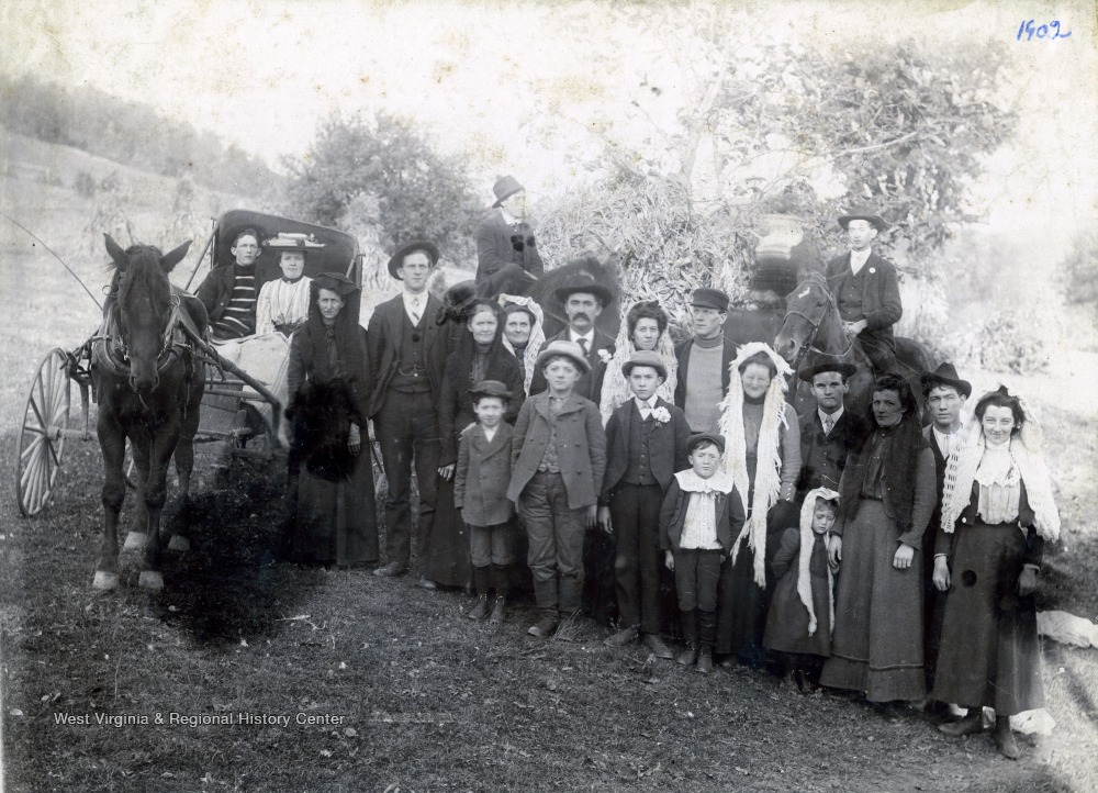 - 'Charley and Iva Burke Summers in buggy; Sarah Raice, mother of John Wesley Summers wife; John Wesley Summers; Nola Huffman, wife of John Huffman; Phoebe May; John Huffman; Clara Raice, a sister of John Wesley Summers wife; Ira Summers; Fannie Summers; Ernie Simpson; Florence Shahm Nose; Andy Hardsaw; Sadie Pierce; front row: Noren Raice; Harlow Runner; Wade Huffman; J. L. Huffman; Florence Shahm Nose - daughter; Artemis Pierce - on back of horse; Effy Huffman - on horse'
