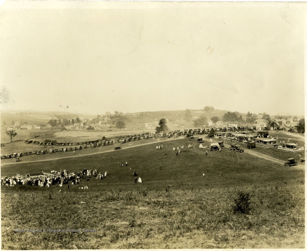 - Cars lined up for a Ku Klux Klan meeting with Morgantown homes in the background.