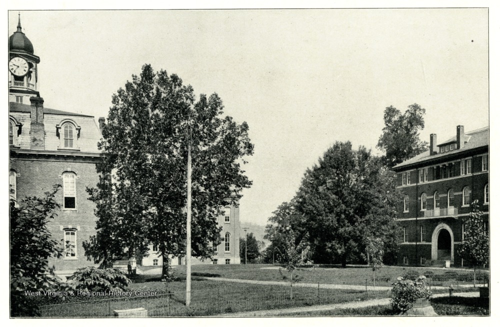 - 'This part of the campus shows the Circle and corners of Martin Hall, Science Hall, and University Hall.' The picture is from a booklet, 'West Virginia University and its Picturesque Surroundings, 1901.'