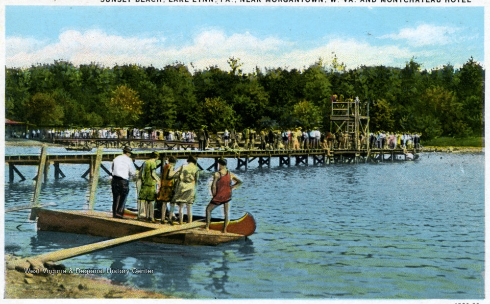 - A view of crowds on the piers and in a boat. The Sunset Beach, Lake Lynn, Pa. located near Morgantown, W. Va. and Montchateau Hotel.