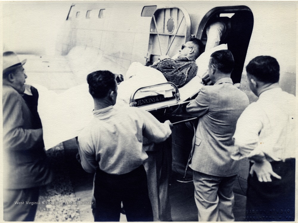 - 'First Army plane of field-DCZ hospital plane. This picture shows the removing of Major Ennis(WVU) for treatment in Walter Reid Hospital. Left to right: Col. C. C. Robison, Clyde Hoskins, Dr. Earl N.McCue, Chas E. Jenkins in airplane.'