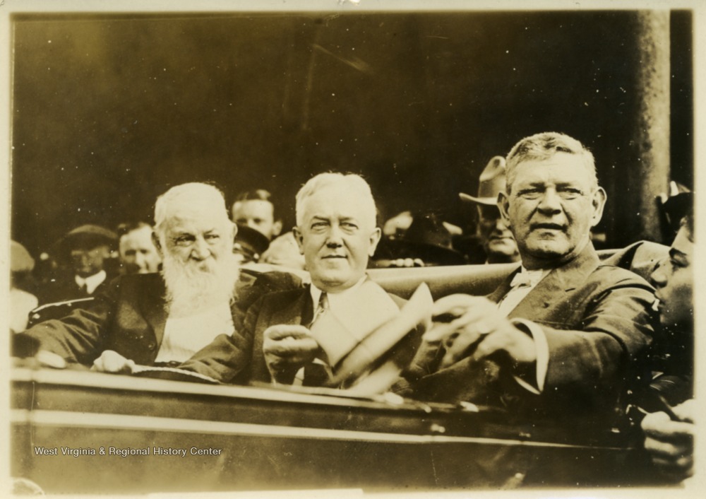 - Davis (center) arriving in Clarksburg. Bearded man at left is John C. Johnson of Bridgeport.