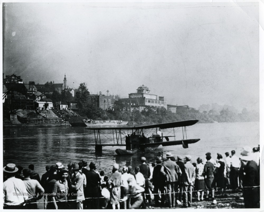 - Behind the plane, the town of Westover can be seen, as a crowd gathers on the Morgantown river bank.