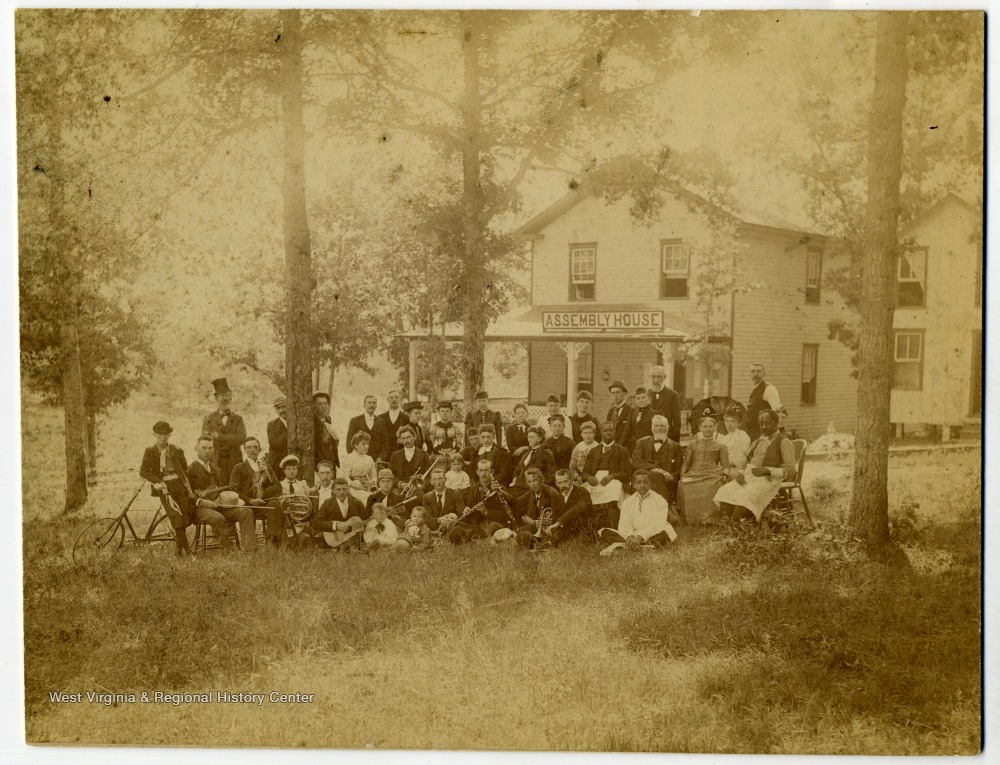 - Group portrait of several men, women, and children, many holding instruments, pose outside "Assembly House".