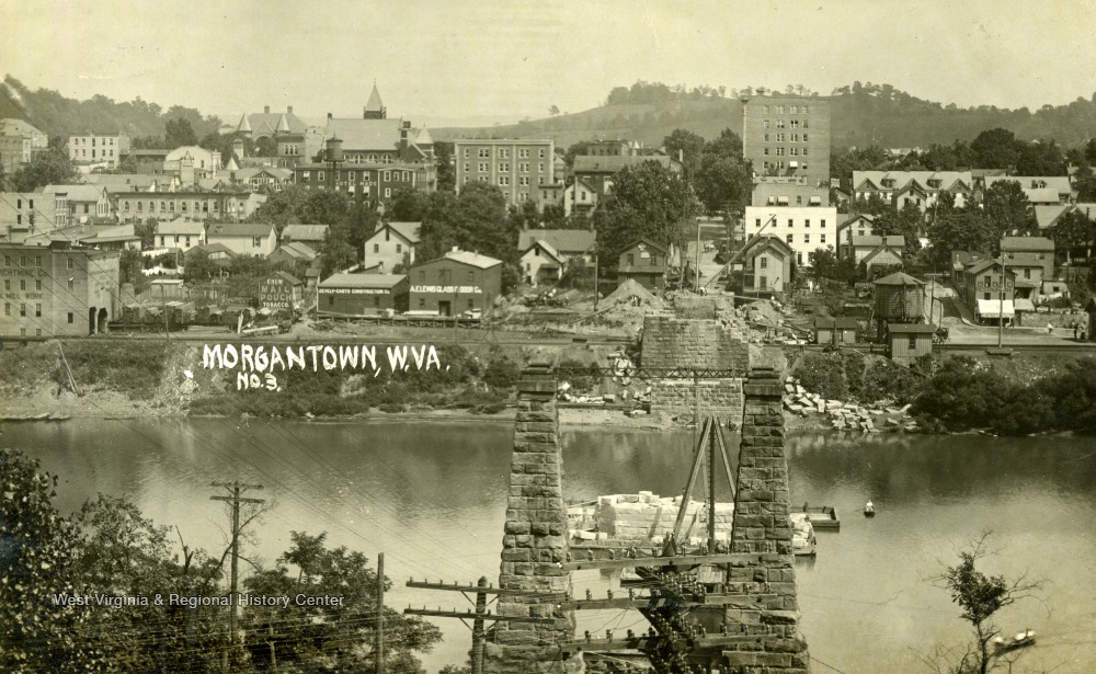 - Postcard photograph of the old suspension bridge razed, in order to built a new bridge over the Monongahela connecting Westover and Morgantown, West Virginia. See the original for the correspondence written on the back.