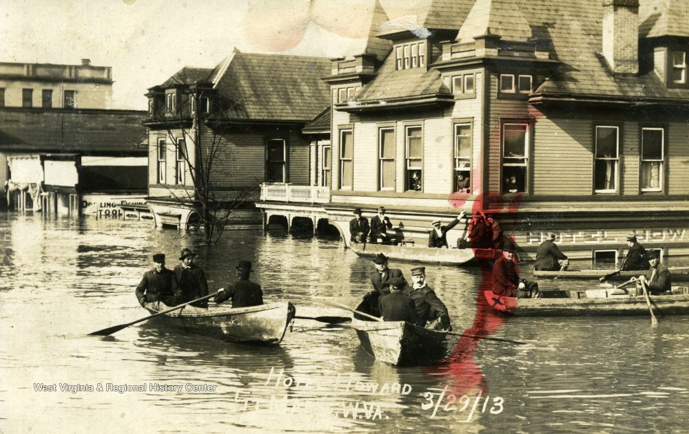 - Postcard photograph of the Hotel Howard half submerged in flood waters and several rowboats being used to navigate through town during a major flood in St. Marys, West Virginia. See the original for the correspondence written on the back.