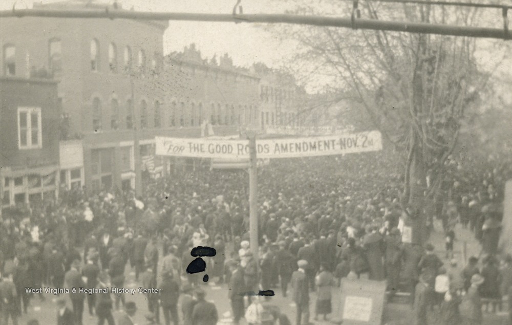 - Banner over the road in photograph reads: "For The Good Roads Amendment November 2nd".