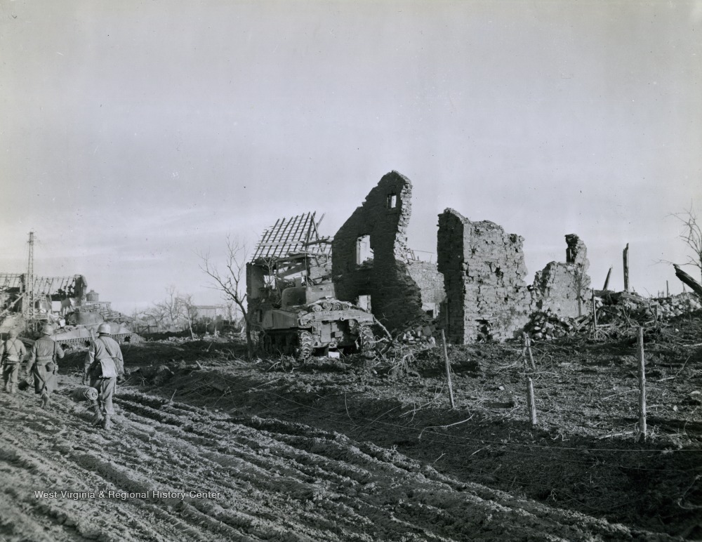 - Tanks and soldiers traveled past destroyed buildings as they push through Germany in the spring of 1945.