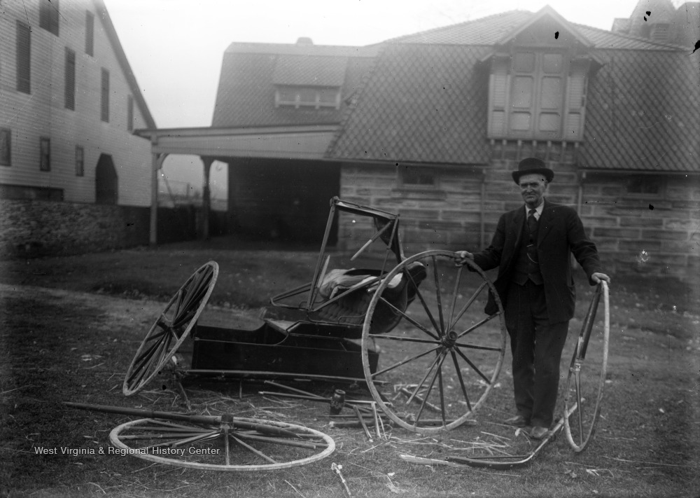 - Unidentified Man Holds Wheels of Wrecked Buggy, Foxburg, Pa.