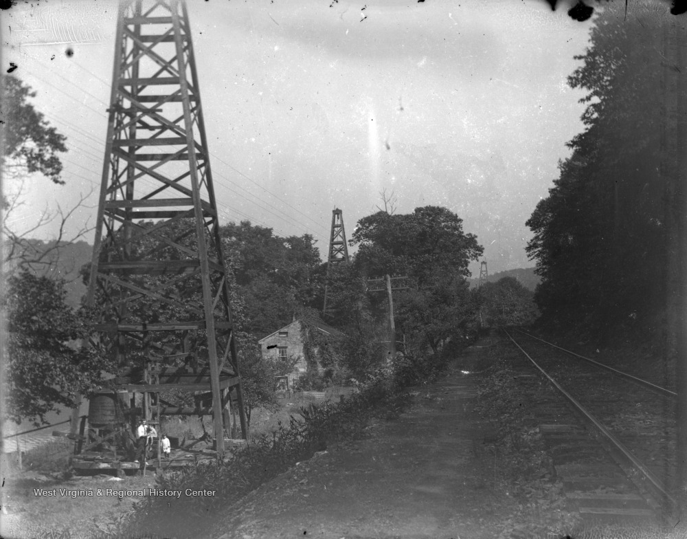 - Wooden Standard Oil Rig, James E. Green Sr. and Jr. Stand at Closest Derrick, in Between Derricks is Stone House Dating Back to George Washington's Time, Foxburg, Pa.