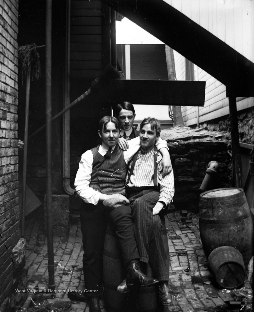 - Three Young Men Sitting on Barrel in Alley, Morgantown, W. Va.