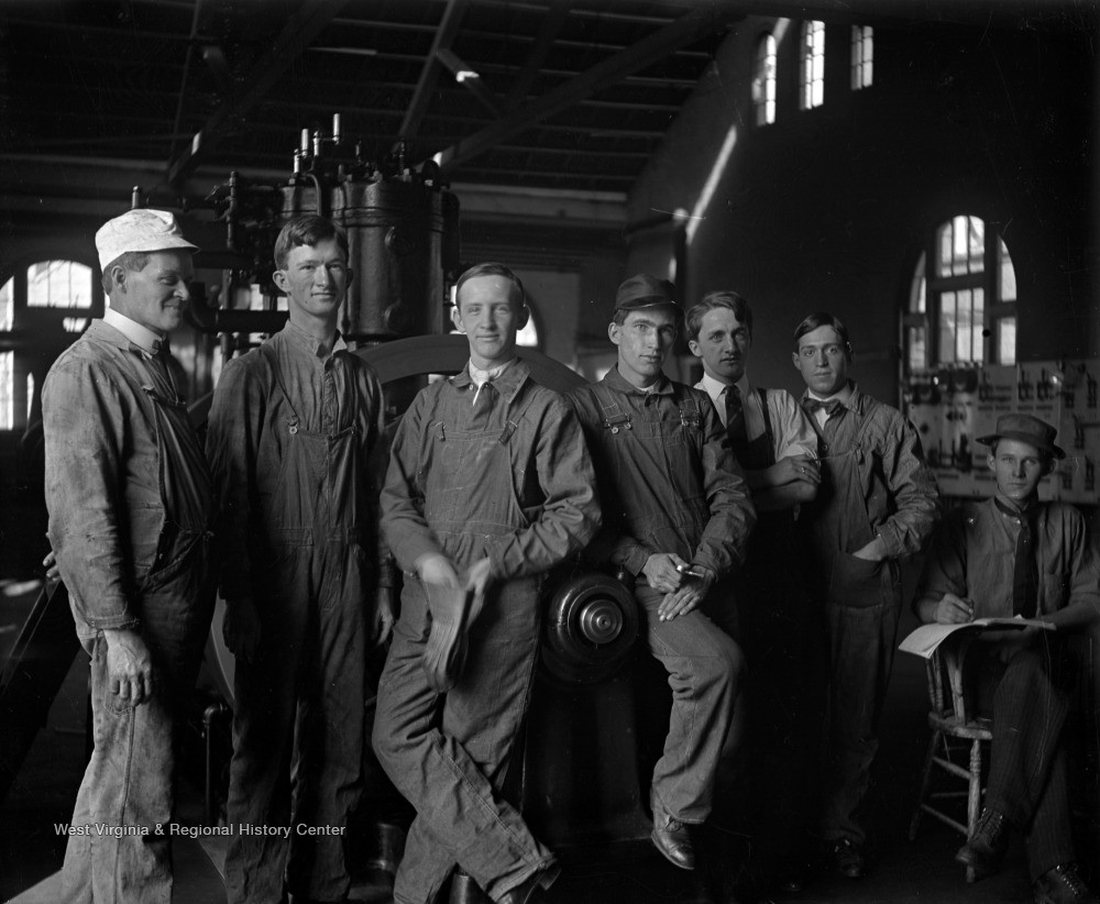 - Group of Men in Work Clothes in Factory, Morgantown, W. Va.