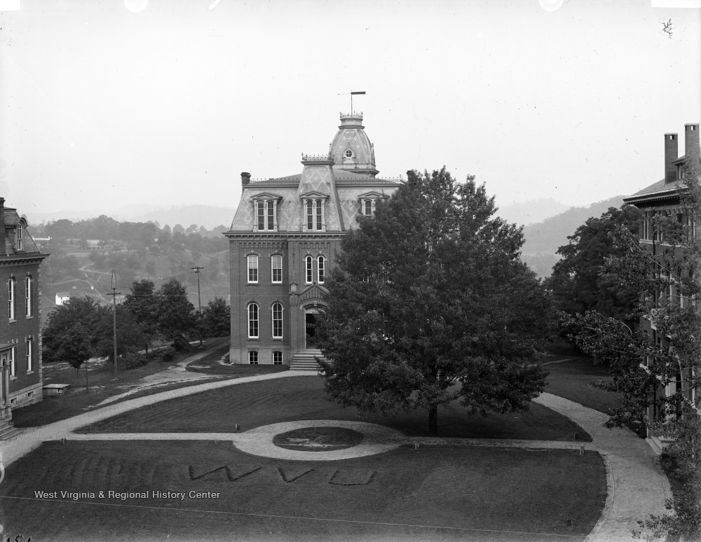 - Image shows Woodburn Hall without the wings and displays "WVU" dug into the grass in Woodburn Circle.