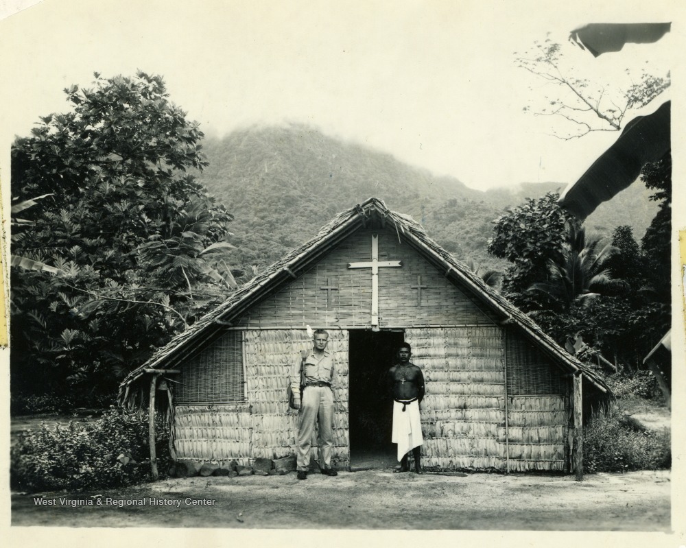 - Marshall L. Williamson, U.S. Navy Medical Corps, assigned to the 57th Naval Construction Battalion (Seabees), stands with an islander at a chapel near his camp on the island of Espiritu Santo, within the New Hebrides.