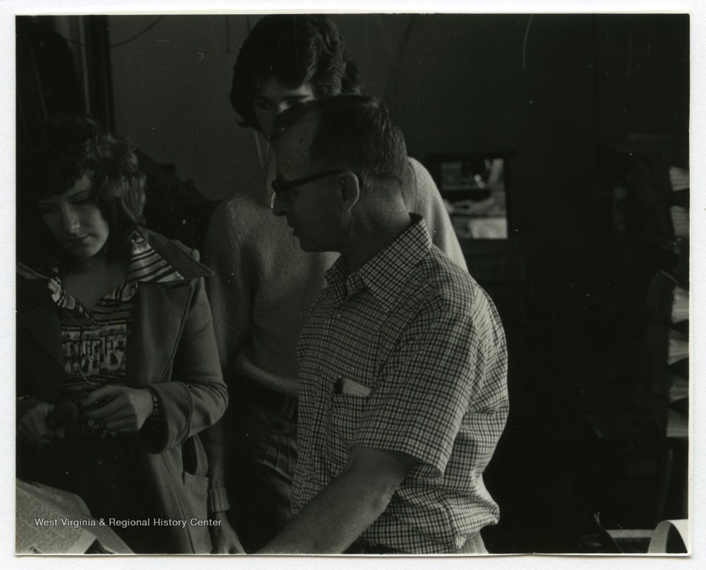 - Woodrow "Woody" Wilson, owner of the Wirt County Journal, talks to two unidentified students at the office of the Wirt County Journal in Elizabeth, West Virginia.The photos in this collection were used in chapters that appeared in Mountain Trace, a publication of Parkersburg High School in West Virginia, edited by Kenneth G. Gilbert.