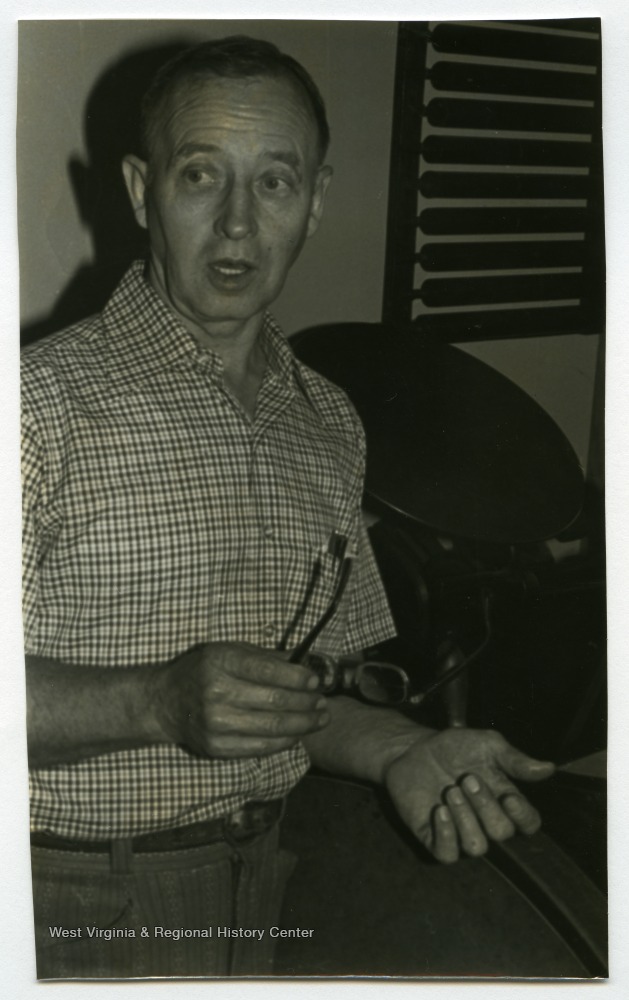 - Woodrow "Woody" Wilson, owner of the Wirt County Journal, speaking at the newspaper office in Elizabeth, W. Va.The photos in this collection were used in chapters that appeared in Mountain Trace, a publication of Parkersburg High School in West Virginia, edited by Kenneth G. Gilbert.