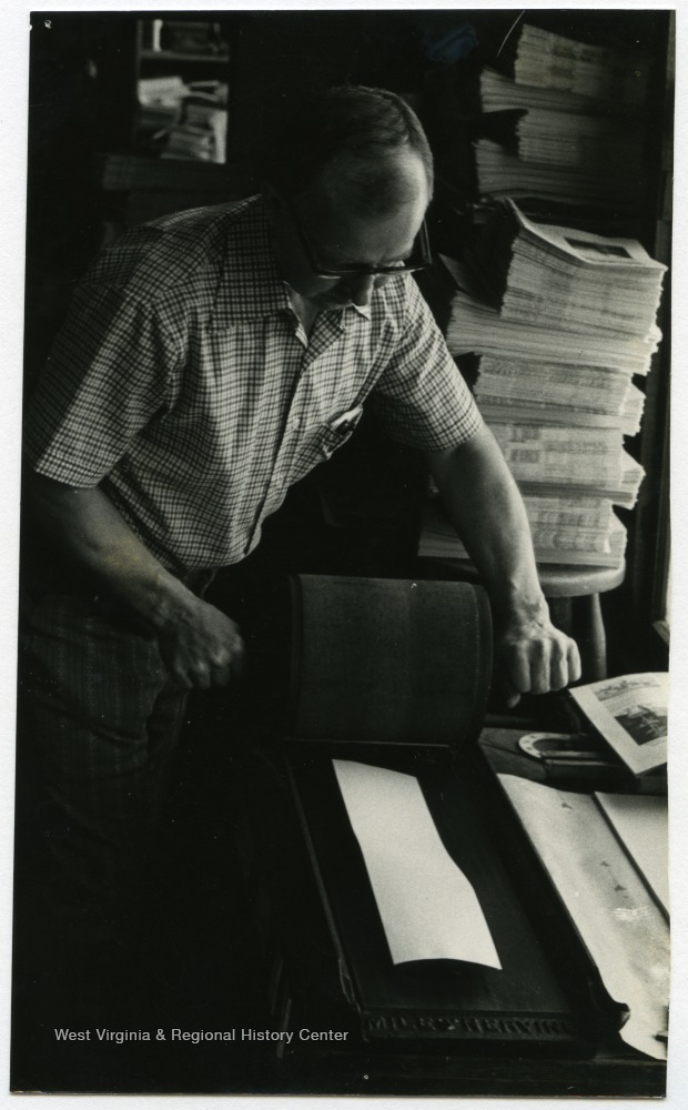 - Woodrow "Woody" Wilson, owner of the Wirt County Journal, in the office of the newspaper in Elizabeth, W. Va.The photos in this collection were used in chapters that appeared in Mountain Trace, a publication of Parkersburg High School in West Virginia, edited by Kenneth G. Gilbert.