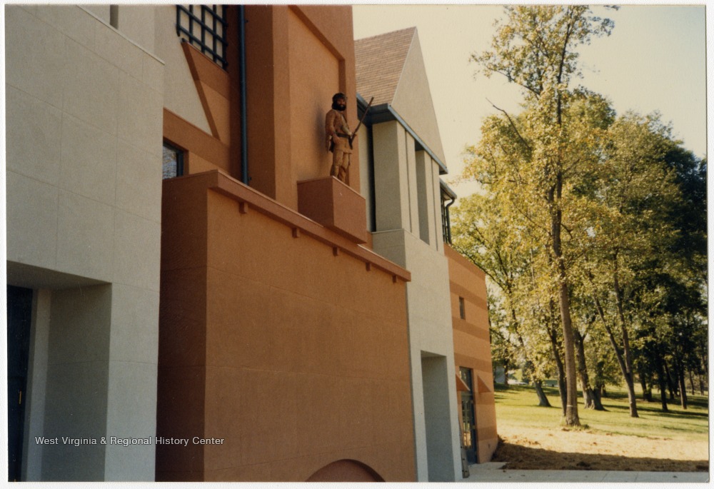 - West Virginia University's 1986-1987 mascot poses on a wall of the building to celebrate the Grand Opening of the Alumni Center.